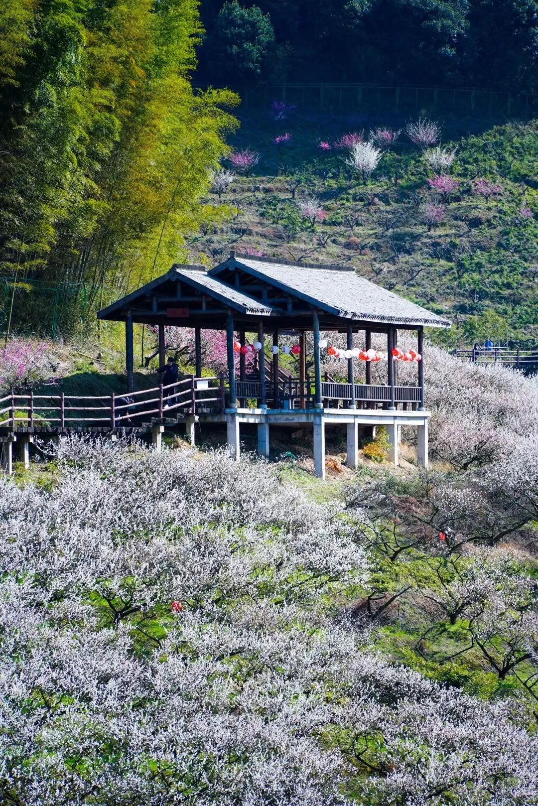 美味的午餐过后,女神们行走在原木栈道上,俯瞰着漫山遍野的花海,任由淡淡花香随风拂面;透明的玻璃桥,横跨两山之间,悬挂氧吧之上,离地之高超过百米,暖阳在点点白梅中穿越,远眺繁花似锦、云雾缭绕,惊险之余更不乏意趣……