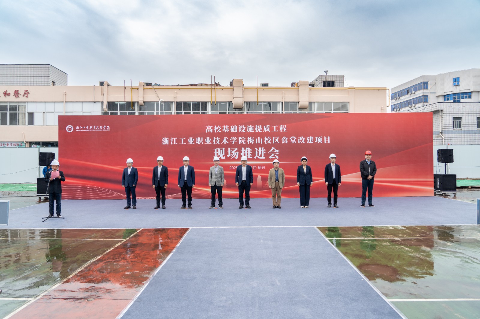 秋实满枝正当时,校园焕新再出发。10月30日上午,浙江工业职业技术学院梅山校区食堂改建项目正式开工。浙工院党政领导班子、相关部门负责人、学生代表,项目施工、监理、设计、勘察、审计等参建单位代表们齐聚一堂,共同擘画校园民生工程新篇章。本次推进会由浙工院党委委员、副校长林克伟主持。